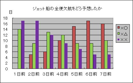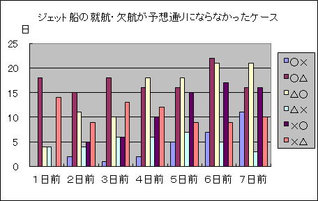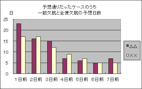 | 予想が外れた場合の分析 左の記号が実際、右の記号が予想。 例示、○×は全便就航したのに×と予想した、という意味です ○△の率が高いのは、判断が微妙なときに悪めに予想していることの表れだと思われます。 ○ 全便就航 △ 一部就航(予想の場合、欠航の可能性あり、を含む) × 全便欠航 |
