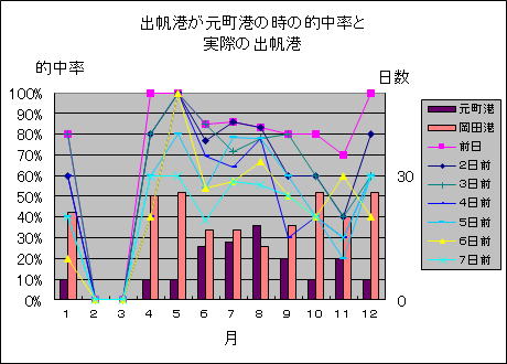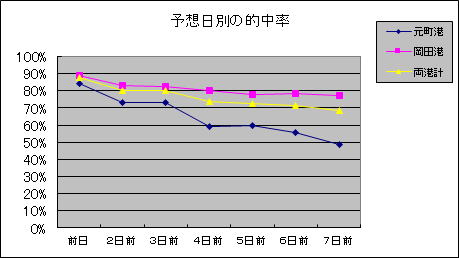 | 元町港・岡田港を合わせたこの期間の平均の的中率は 前日・・・・88% 7日前・・・69% |