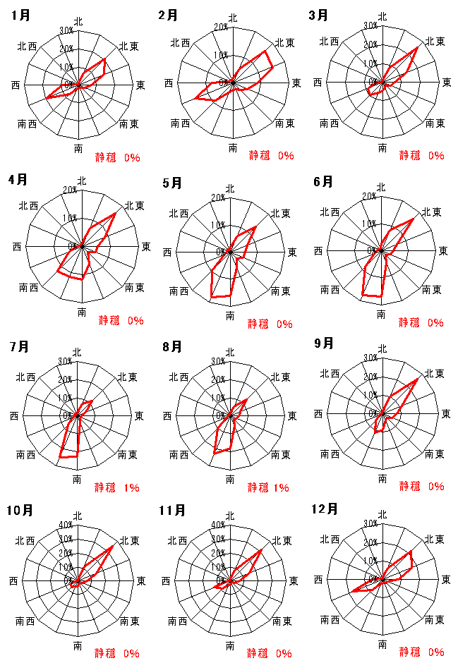 | 大島の月別風向出現率(東京管区気象台HPより) |