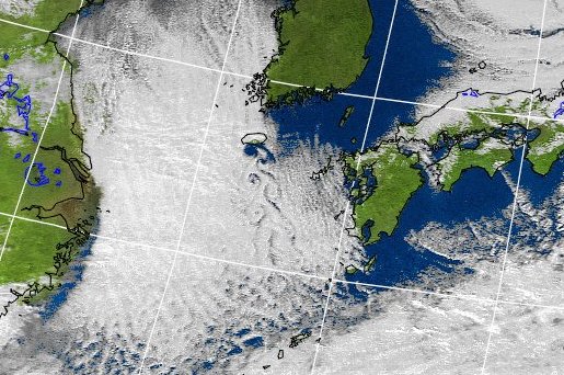 その収束線は、房総沖前線(1)、伊豆諸島北部収束線(2)などと呼ばれ、昔からよく知られている。上空の寒気が強い時には収束線付近に積雲列が発達してその下ではにわか雨やあられを伴っていることもあるが、寒気が強くない時には雲が無く晴れていることもある。また、積雲列をその形状から、ならいの土手、と呼ぶこともある。収束線の北側は北東の風、南側は西よりの風になっている(左上図)。従って、収束線が大島の南にあれば北東風、北にあれば西よりの風になり、収束線が移動して大島を通過する時には風向が急に変わることになる。 カルマン渦列虎落笛(もがりぶえ)とは、木枯らしが電線や竹垣などに吹き付けた時に発生する風の音だそうだ。風が障害物の後ろに交互に渦を発生させるので、その結果、振動が発生して音が出る。その渦の列をカルマン渦列という。空気は透明なので、普通、私たちはそれを目で見ることはできないが、冬型の気圧配置の時、東シナ海チェジュ島の風下にカルマン渦列が発生することがあって、気象衛星の画像でその様子を見ることができる(下図)。日本付近では、この他に海洋上の孤立峰である屋久島や利尻島などの風下でも発生することが知られている。
