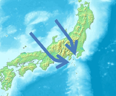 | ところで、このようなほんの少しの気圧配置の差から、なぜ全く反対といっていいような風の現況を生じるのだろうか。それには、大島と本州の地理的な位置関係が深く関わっている。 本州中央部に吹き付ける季節風の下層流は、中部山岳が障壁となって西回りと北回りに分流し、西回りは若狭湾から伊勢湾を吹き抜け、北回りは上越国境の山脈を越えて関東平野を吹き抜け、伊豆諸島北部付近で合流しそこに収束線を形成する(右図) |