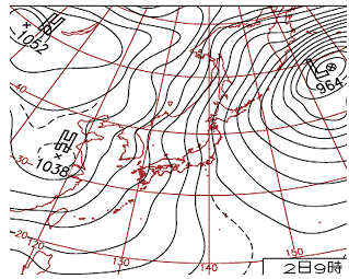 上の二つの天気図から大島の風向・風速を考えてみよう。 右図のような時には西風の強風域が相模湾の奥まで入り込むが、左図のように等圧線の走向が南北の時には、新島以南が西の強風でも大島付近は北東の風になる。この違いを天気図から予想するのはなかなか難しいのだが、33時間予報MSM(Mesoscale Spectral Model)はかなり正確に予想している。 |