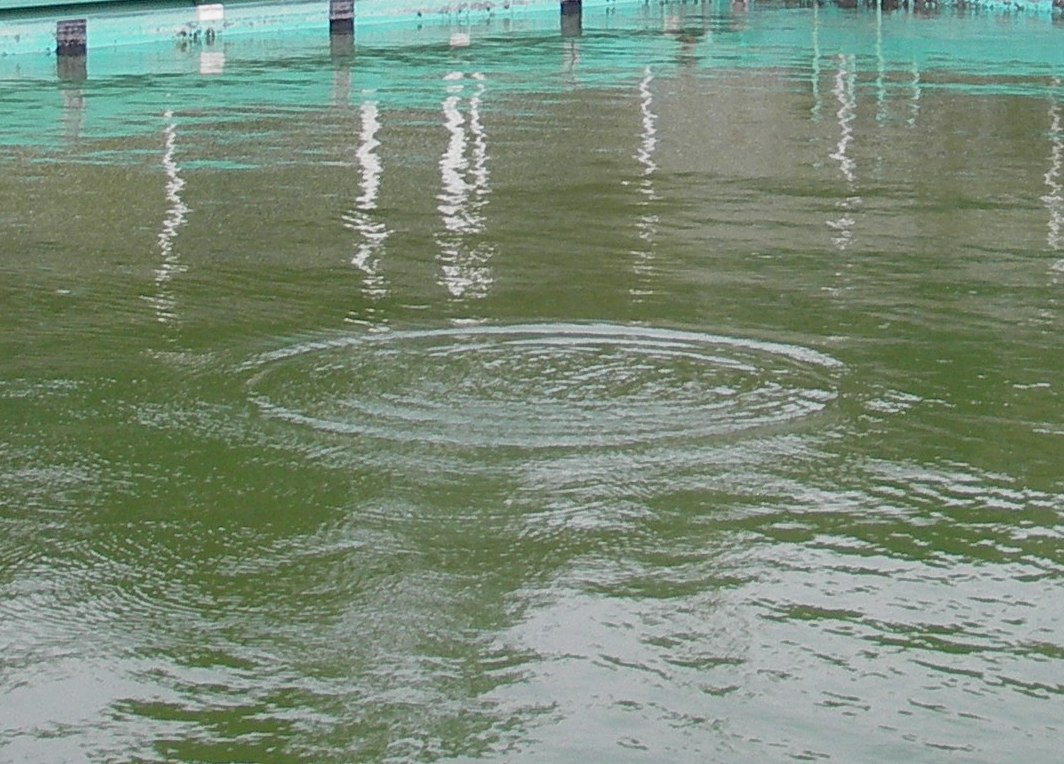 海の波の伝わる速さはどのくらいだろうか。 深海波(表面波)水深が波長の1/2より大きい場合、海底の影響をほとんど受けないので、このような波を深海波(表面波)という。深海波の波速C(m/s)は近似的に波長L(m)だけで決まり で表される。 また、波長と波速、周期T(s)には次の関係がある。 風波 : 海上で普通に見られる風波の波長は数十m程度なので、大雑把に100mとして計算すると、波速は12.5m/s(45km/h)、周期は8.0秒になる。 うねり : 海の波は主に風によって発生し発達するが、発達した波は風がない海域に入っても次第に減衰しながら遠くまで伝播する。このとき、波長の短い波ほど早く減衰するので、波長の長い波だけが残ることになる。このような波をうねりという。 うねりの到達時間台風が北緯20度線を越えるとうねりが到達し始めることが経験的に知られている。北緯20度付近にある台風からのうねりの到達時間を計算してみよう。仮に、うねりの周期を12秒とすると波長は225m、波速は18.7m/s(67km/h)になる。ただし、次の理由によって波速18.7m/sは使えない。 位相速度と群速度桟橋に立って沖から寄せてくる一つの波の峰に注目していると、いつの間にかその峰を見失ってしまう、といった経験をした人も多いだろう。池に石を投げ込んだ時の 個々の波の伝わる速さは位相速度、波が全体として伝わる速さは群速度と呼ばれ、深海波では群速度は位相速度の1/2になる。波のエネルギーは群速度で伝わってくるので、うねりの到達時間を計算するには位相速度ではなく群速度を用いて計算しなければならない。前記の波長225mのうねりは、位相速度は18.7m/s(67km/h)だが群速度はその1/2の9.4m/s(34km/h)。大島と北緯20度付近までの最短距離はおよそ1600kmなので、うねりの群速度34km/hで割ると、47時間という結果が出る。小笠原の南、北緯20度付近にある台風からのうねりは、2日がかりでやってくる。 このことはまた、台風が台湾方面から大陸へ上陸して衰弱しても、2〜3日はうねりがおさまらない、ということにも関係している。