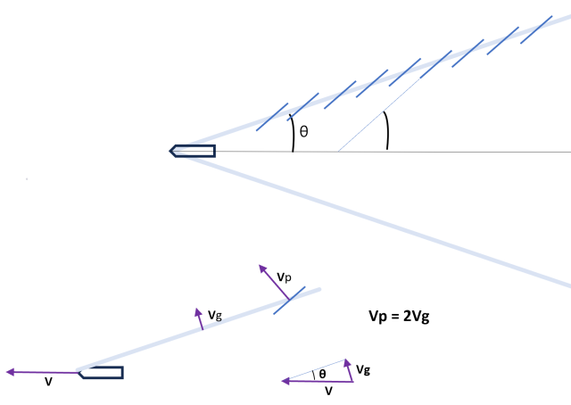右舷側の曳き波に注目してみよう。小さな波の列がハの字の曳き波を構成していることがわかる。小さな波が生まれては消えることをくり返しながら位相速度で進み、全体として曳き波自体は群速度で伝わっている。 船の進行方向と航跡波のなす角をθ、船の速さをV、航跡波の群速度をVgとすると、 |