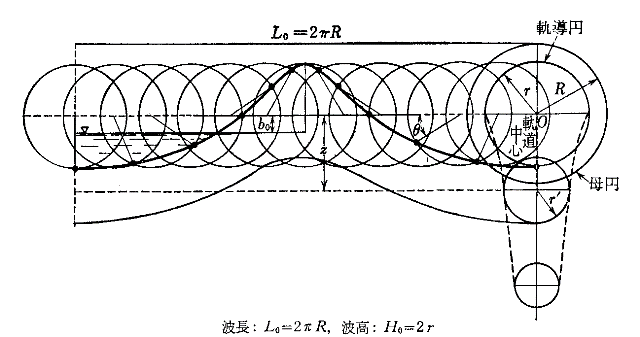 単一の波実際の海の波は複雑な様相を示しているが、それは波長の異なるいくつもの波の重なり合いとしてと らえることができる。それを構成している一つの波はトロコイドという曲線で表される。トロコイドとは、ころがる円と共に回転する点が描く軌跡で、山の幅が狭く谷の幅が広い形なっている(下図)。水の粒子が円運動しているために、波の形は正弦波ではない(水の粒子が上下に単振動していれば正弦波になる)。このとき水面の水粒子が描く円の直径が波高、円周が波長ということになる。 |