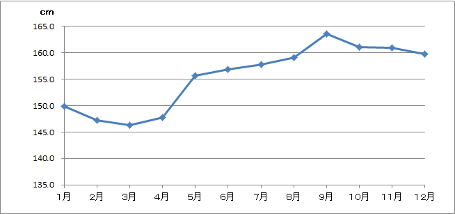 | これに伴う海水の熱膨張のため験潮所のある岡田港の潮位を見ると、2月より9月の平均潮位が17cmほど高い(下図)。またこれは、この頃が台風シーズンであることもあり高潮の危険が増すことにも関係している。 さらに、地球温暖化による海面上昇が懸念されているが、海面上昇の原因として海水の熱膨張が最も大きく影響する、とされている。詳しくは、気象庁HP海面水位の変動要因をご覧下さい。 |