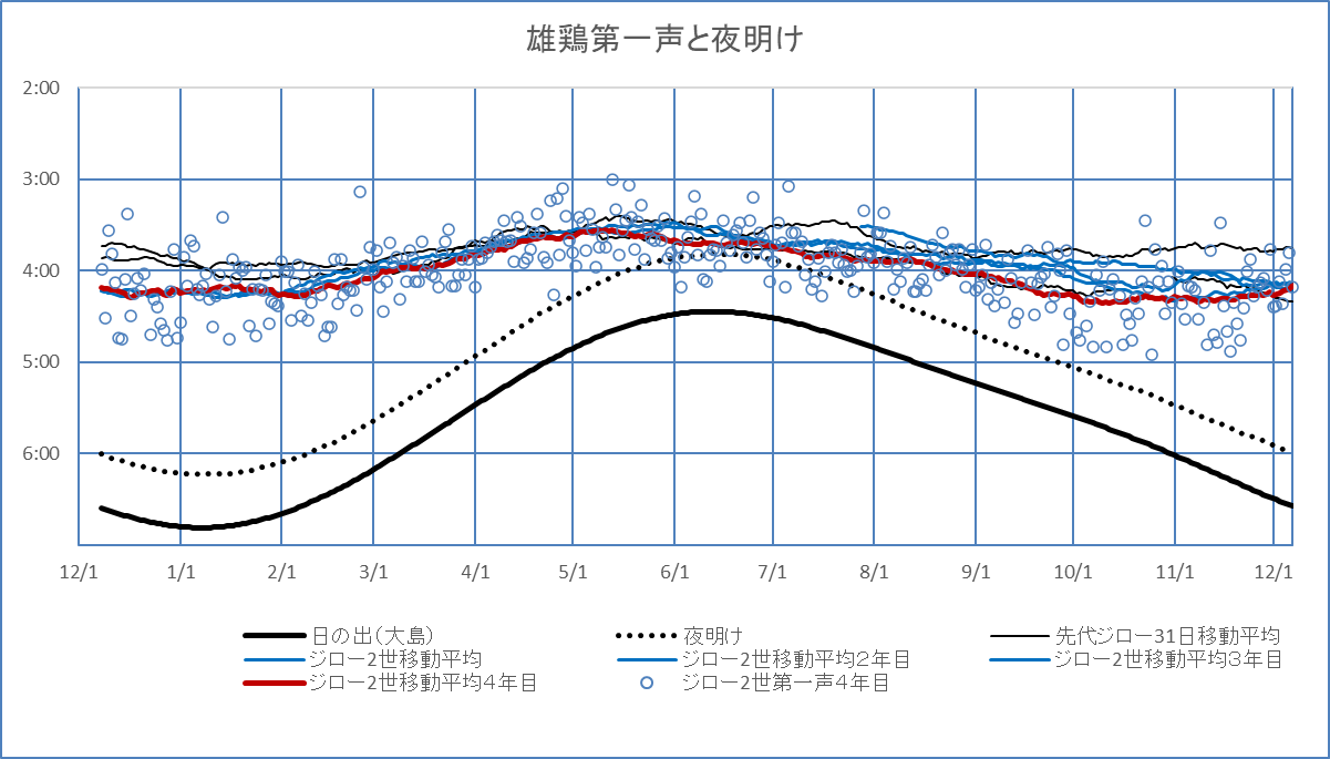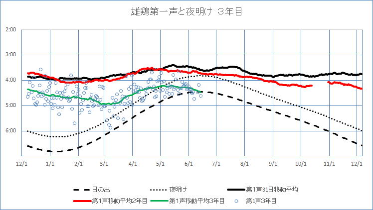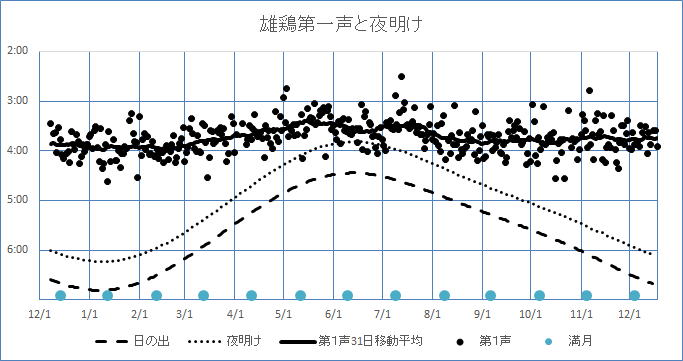 | 日々のばらつきをならして31日移動平均でみると、ジローの第一声は2月初めが最も遅く4時ごろ、5月半ばが最も早く3時25分ごろでした。夜明けの季節変化と位相は概ね一致しているように見えます。ただし、夜明け時刻の季節変化量2時間25分に比べてコケッコーの季節変化量は35分と4分の1弱、夜明けの2時間前に鳴く、ということではなさそうです。 雄鶏の鳴く時刻は体内時計によって制御されているということは確かですが、その体内時計は夜明けの時刻にだけ同調しているのではなく(多分、夕暮れの時刻にも同調していて)年間を通して大きな変化はない、というように私には見えます。 |