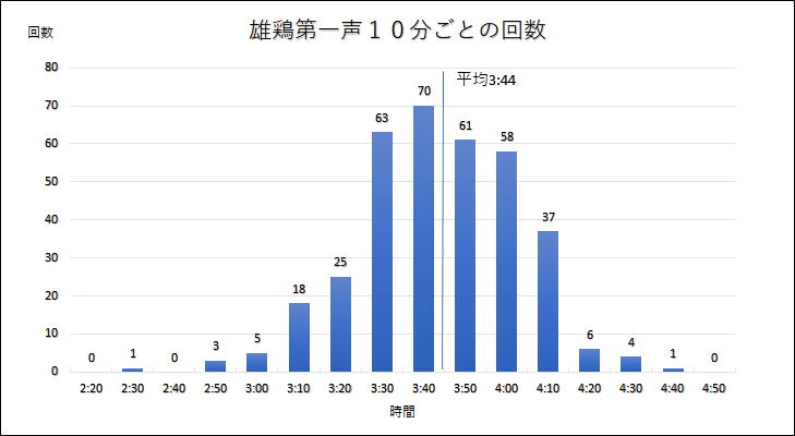 大雑把に、季節変化を無視して、第一声時刻全部を10分ごとの度数分布で見たのが上のグラフです。平均は3時44分、標準偏差が19分37秒であることから平均の前後20分に7割程度が入ることになり、ざっと3時半から4時の間に鳴くことが多い、という以前からの私の印象はあながち間違いではなかったと考えます。ただし、たった1羽の観察対象なので一般的に雄鶏のコケッコーはこうだ、とは言えないと思います。観察を継続します。2年目3年目の記録ジロー満5歳を超えたあたりから鳴き始めの時刻が徐々に遅くなってきました。加齢のためでしょうか。2019.1.13 |
