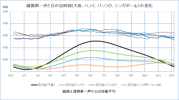 | 2022.5.1 これまでの観察で ① 雄鶏の鳴き始める時間は季節によって30分程度変化するが、夜明け時刻の変化(2時間25分)より小さい ことが分かりました。 一方 ② 名古屋大学吉村崇教授の研究によれば、人工的な12時間ごとの明暗の環境下では、明るくなる2時間前から予知的に鳴き始める ことが分かっています。 先代ジローの記録編を参照してください。 当地(伊豆大島)の夜明けにあわせて2時間前から鳴き始めるなら2時間半程度の季節変化をする筈ですが、実際は30分程度の変化でした。 30分程度の変化という、なんとなく中途半端な変化はどこから来るのでしょうか。 最近、セキショクヤケイの捕獲シーンの動画をYouTubeで見る機会がありました。東南アジアでは、まだ、相当数の野鶏が生息しているようです。 鶏は東南アジアに生息する、セキショクヤケイなどの野鶏を5000年以上も前に人間が家畜化したものだといわれています。鶏の先祖はセキショクヤケイ、というわけです。 そこで、鶏は生まれ故郷の夜明け時刻の変化を記憶しているのではないか、と考えて、 セキショクヤケイの生息地域の夜明けの季節変化を確認してみました。 コケコッコー第一声の年変化グラフに、大島(北緯35度)とセキショクヤケイの生息地である東南アジアの代表的な2都市、ハノイ(北緯21度)とバンコク(北緯14度)の日の出時間を書き込んでみたのが下のグラフです。 4時前後の数本の細い線は我が家の雄鶏のコケコッコー第一声の記録、下の黒太線は大島の日の出時刻、緑太線はハノイの日の出時刻、青太線はバンコクの日の出時刻です。 なんと、雄鶏は生まれ故郷の日の出の変化に合わせてその2時間ほど前にコケコッコーと鳴き始めている、ように見えます。 春にやや急に早くなって夏から冬に向かってゆっくりと遅くなっていく、グラフの形もよく似ているではありませんか。 注、夜明けは日の出の約30分前ですが季節変化は同じなので、ここでは外国のデータのある日の出を用いました。 雄鶏の体内時計は5000年以上も前の故郷の日の出時刻を遺伝子に刻んでいるのでしょうか。北緯20度前後の日の出時刻変化と一致しているように見えるのはただの偶然なのでしょうか。 |