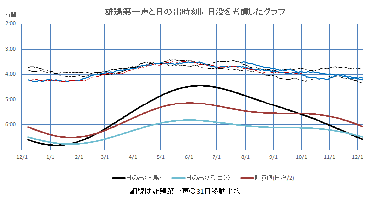 | 2022.10.5 雄鶏が鳴き始める時間はハノイやバンコクの日の出時間の変化によく似ていますが、だからと言って、5000年以上も昔の時間を雄鶏が記憶していると考えるのは無理があるような気がします。 一方、雄鶏の鳴く時刻は体内時計によって制御されているということは確かですが、その体内時計は夜明けの時刻にだけ同調しているのではなく、夕暮れの時刻にもある程度同調しているため、年間を通して大きな変化が無いのではないか、とも考えられます。 そこで、夜明けの時間に対して夕暮れの時間の変化を、割合を変えて差し引くことでシミュレーションしてみました。 下のグラフを見て下さい。 4時前後の数本の細い線は我が家の雄鶏のコケコッコー第一声の記録ですが、日の出に対して日の入りの影響の割合を色々変えてグラフ化したところ、1対0.5の時が第一声の記録の形に一番近くなりました。赤太線が計算値です。 結論として、次のようなことが言えるのではないでしょうか 雄鶏の第一声は、夜明けの時刻に対して夕暮れの時刻も半分程度影響していて、夜明けの時刻から夕暮れの変化の1/2を差し引いた時刻の、1時間30分から2時間程度前に鳴き始めることが多い。 たとえば、冬なら夜明けが遅いので第一声も遅くなるが、夕暮れが早い分睡眠時間が長いのでその影響を半分程度受けて早めに目覚める、といったところです。 |