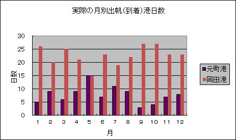 出帆(到着)港は季節によって大きく変化します。冬季の季節風、春先の発達した低気圧の影響で12月から4月、台風の影響で9月、10月が岡田港になることが多くなります。今年は7、8月に岡田港が多くなりました。夏季の天候不順の影響だと思われます。 |