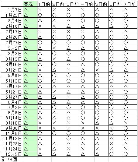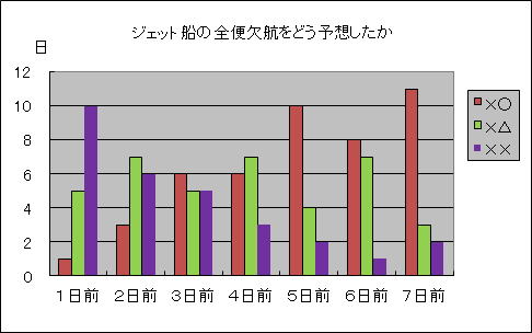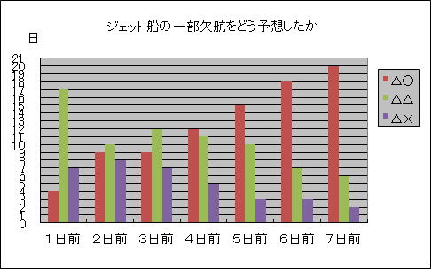 | 予想が外れた場合の分析 左の記号が実際、右の記号が予想。 例示、○×は全便就航したのに×と予想した、という意味です ○△の率が高いのは、判断が微妙なときに悪めに予想していることの表れだと思われます。 ○ 全便就航 △ 一部就航(予想の場合、欠航の可能性あり、を含む) × 全便欠航 3月29日ジェット船全便欠航、なぜ? |