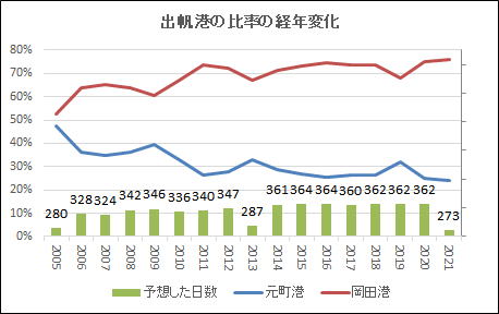| 出帆港がどちらになるか2005年からの変化 (2021年は1月から9月までの集計) |