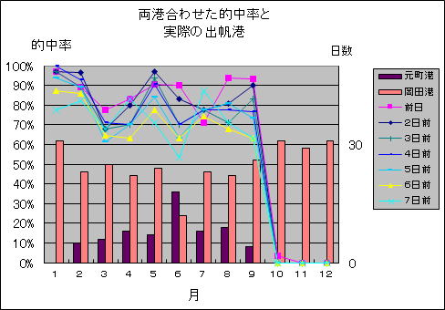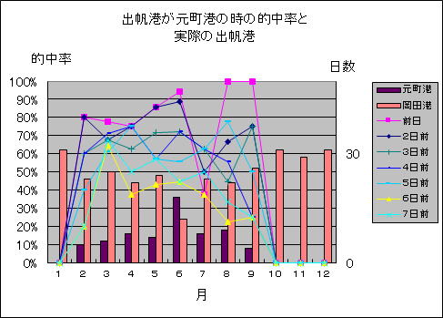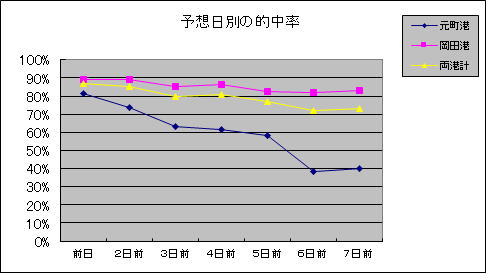 | 元町港・岡田港を合わせたこの期間の平均の的中率は 前日・・・・87% 7日前・・・73% でした。(10月から12月は集計に入れません) |