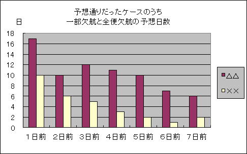 | 実況、全便欠航は16日 (1日前の予想で全便欠航を就航と予想したのは3月29日) |