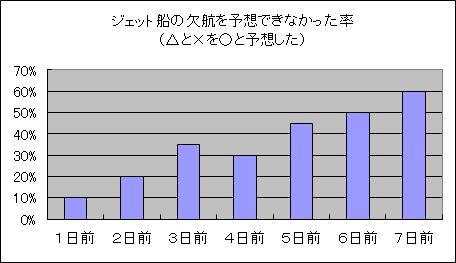 | 一部欠航、全便欠航を○と予想した(欠航を予想できなかった)率 前日の予想で10%、7日先で60% (昨年は前日11%.7日先70%) |