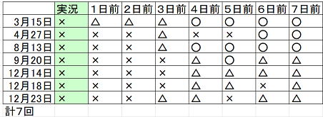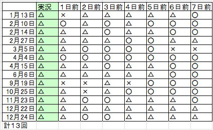 | 予想が外れた場合の分析 左の記号が実際、右の記号が予想。 例示、○×は全便就航したのに×と予想した、という意味です ○△の率が高いのは、判断が微妙なときに悪めに予想していることの表れだと思われます。 特に2022年は1日前に高くなって予想の迷いが表れているようです。 ○ 全便就航 △ 一部就航(予想の場合、欠航の可能性あり、を含む) × 全便欠航 |