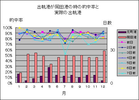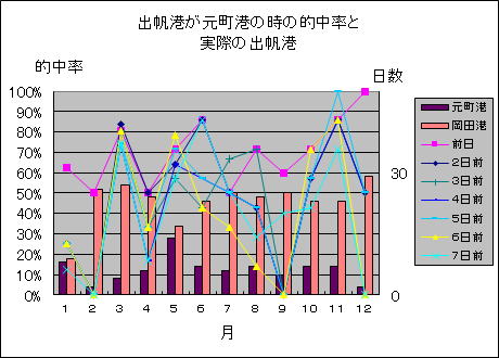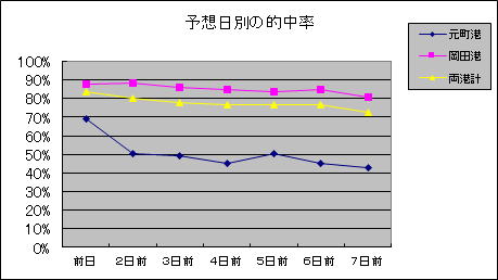 | 元町港・岡田港を合わせたこの期間の平均の的中率は 前日・・・・84% 7日前・・・73% |