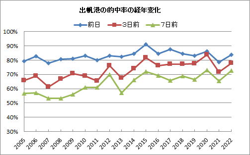 | 年間の出帆港的中率の2005年からの変化 7日前の的中率は上昇傾向だが前日の的中率はほとんど横這い。元になる気象情報の精度は上がってきているが、出帆港予想は限界状態か |