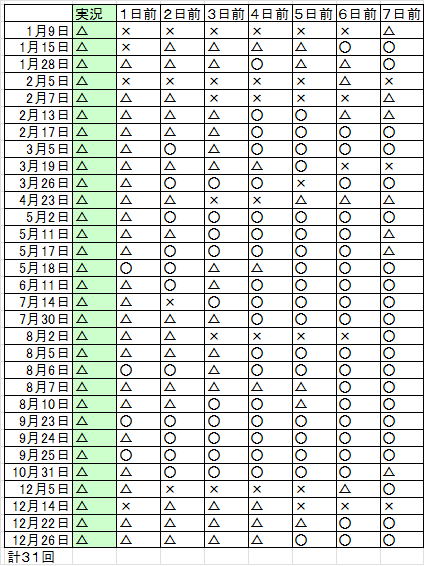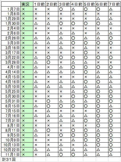 | 予想が外れた場合の分析 左の記号が実際、右の記号が予想。 例示、○×は全便就航したのに×と予想した、という意味です ○△の率が高いのは、判断が微妙なときに悪めに予想していることの表れだと思われます。 ○ 全便就航 △ 一部就航(予想の場合、欠航の可能性あり、を含む) × 全便欠航 |