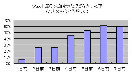 | 一部欠航、全便欠航を○と予想した(欠航を予想できなかった)率 前日の予想で6%、7日先で60% (昨年は前日10%.7日先73%) |