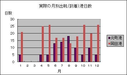 | 出帆(到着)港は季節によって大きく変化します。 年間では 元町港・・・90日 岡田港・・・209日 椿まつり期間中の1月27日から3月31日まで元町港船客待合所が総合案内所として使用されたため岡田港出帆となりました。そのためこの期間は集計から除いてあります。 |