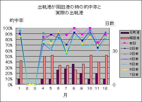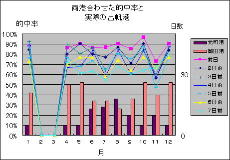 | 元町港・岡田港を合わせたこの期間の平均の的中率は 前日・・・・88% 7日前・・・69% |