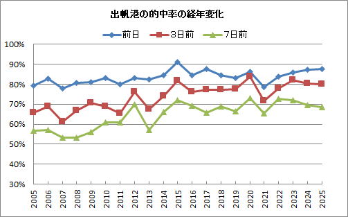 | 全便欠航、一部欠航を○と予想した率の2005年からの変化。 縦軸左目盛りが率、右目盛りは年間欠航日数(一部欠航を含む) 7日前から欠航を予想するのは難しい。 |