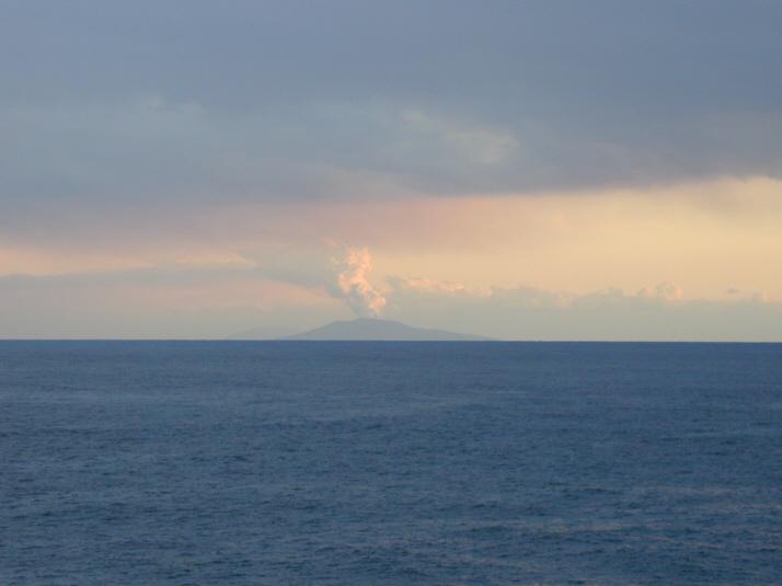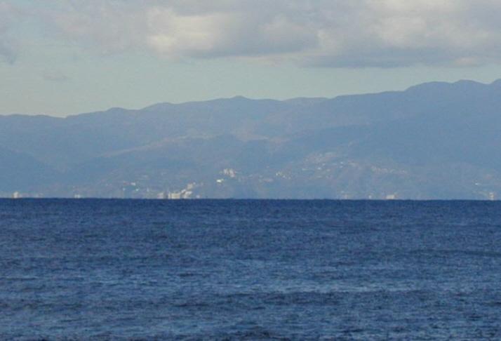 晴れて水平線がくっきり見えるときには地球が丸いことを実感できる。 左の写真、中央の白い建物が見える町は熱川、低いところにある港や道路などの構造物は水平線の下になり見えない。 右の写真は、三宅島が噴火し多量のSO2を含む噴煙を放出するようになって半年後の映像。 水平線がくっきり見えること自体、地球が丸いから。